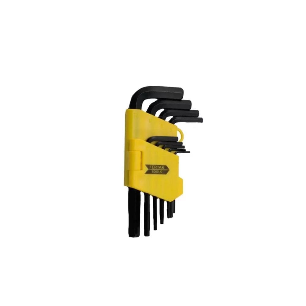 Jogo de Chaves Hexagonais (Allen) Modelo Curta. Fabricado em aço cromo vanádio. Formato em “L” proporcionando efeito alavanca, minimizando o esforço físico do usuário. Possui borda chanfrada o que permite um encaixe rápido e perfeito entre a chave e o parafuso. Contém medidas estampadas em baixo relevo facilitando a identificação da ferramenta. Utilizado para aperto e desaperto em parafusos com sextavado interno. Acompanha suporte plástico. Composto por 9 peças, com as seguintes medidas: 1,5 – 2 – 2,5 – 3 – 4 – 5 – 6 – 8 – 10 mm. Marca: FertaK Tools.
