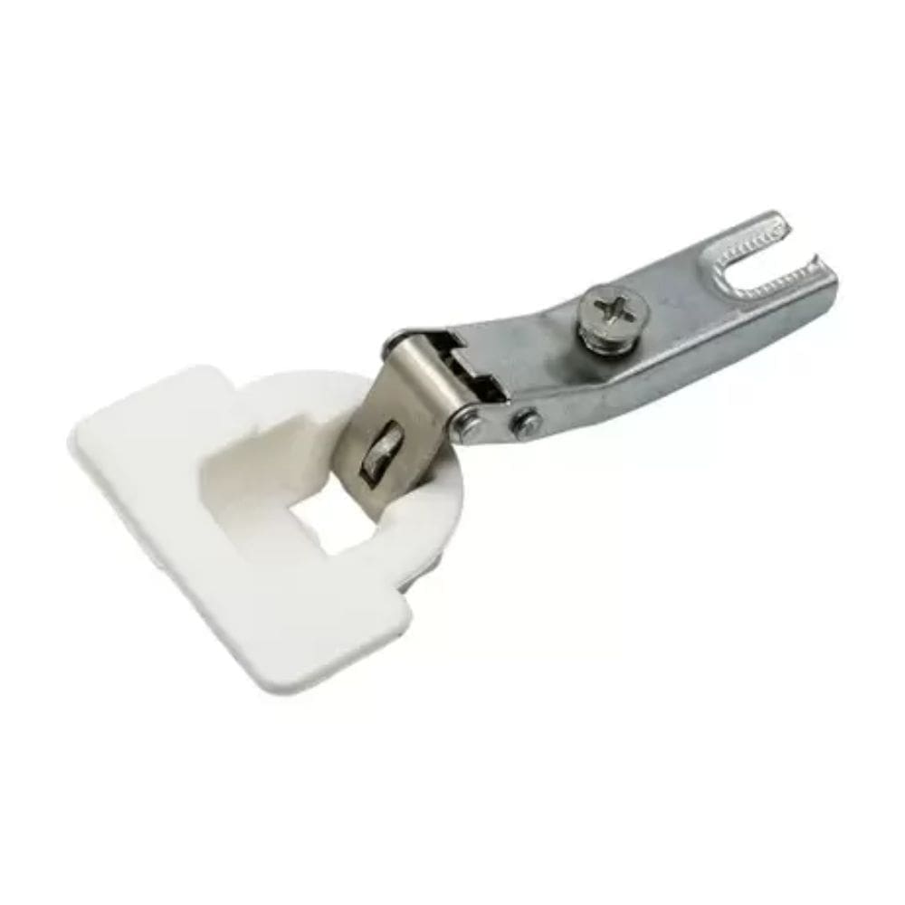 Dobradiça com caneco plástico na tonalidade branca para armário Itatiaia do tipo de pressão com caneco de plástico.