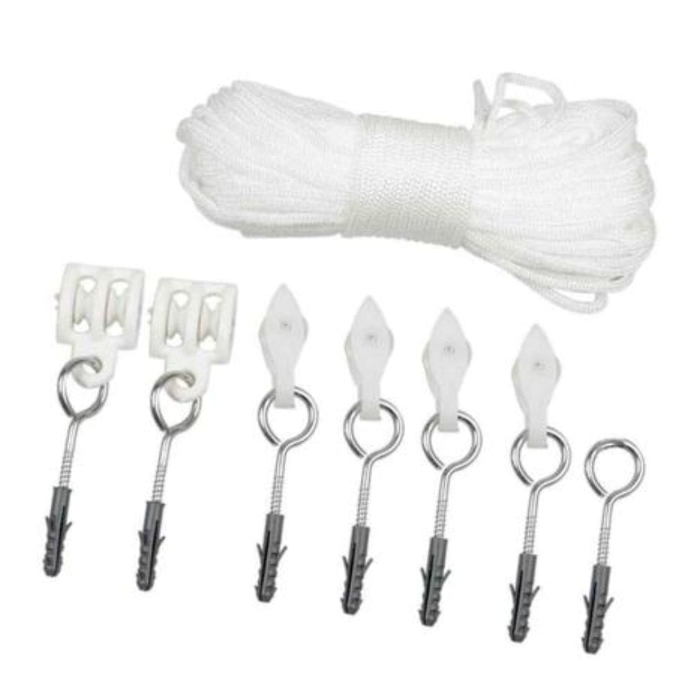 É um kit completo para varal de teto. Kit Carretilha para Varal de Teto possui 1 corda de 15 metros é resistente e duradoura. possui sete buchas n°6 e seis carretilhas.