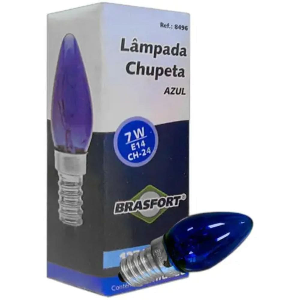 Lâmpada Chupeta Incandescente Azul E14 Brasfort 7W – 127V. Utilizada em lustres, abajur, spots, luminárias, etc. Bulbo de vidro com filamento em tungstênio e soquete de material não ferroso.