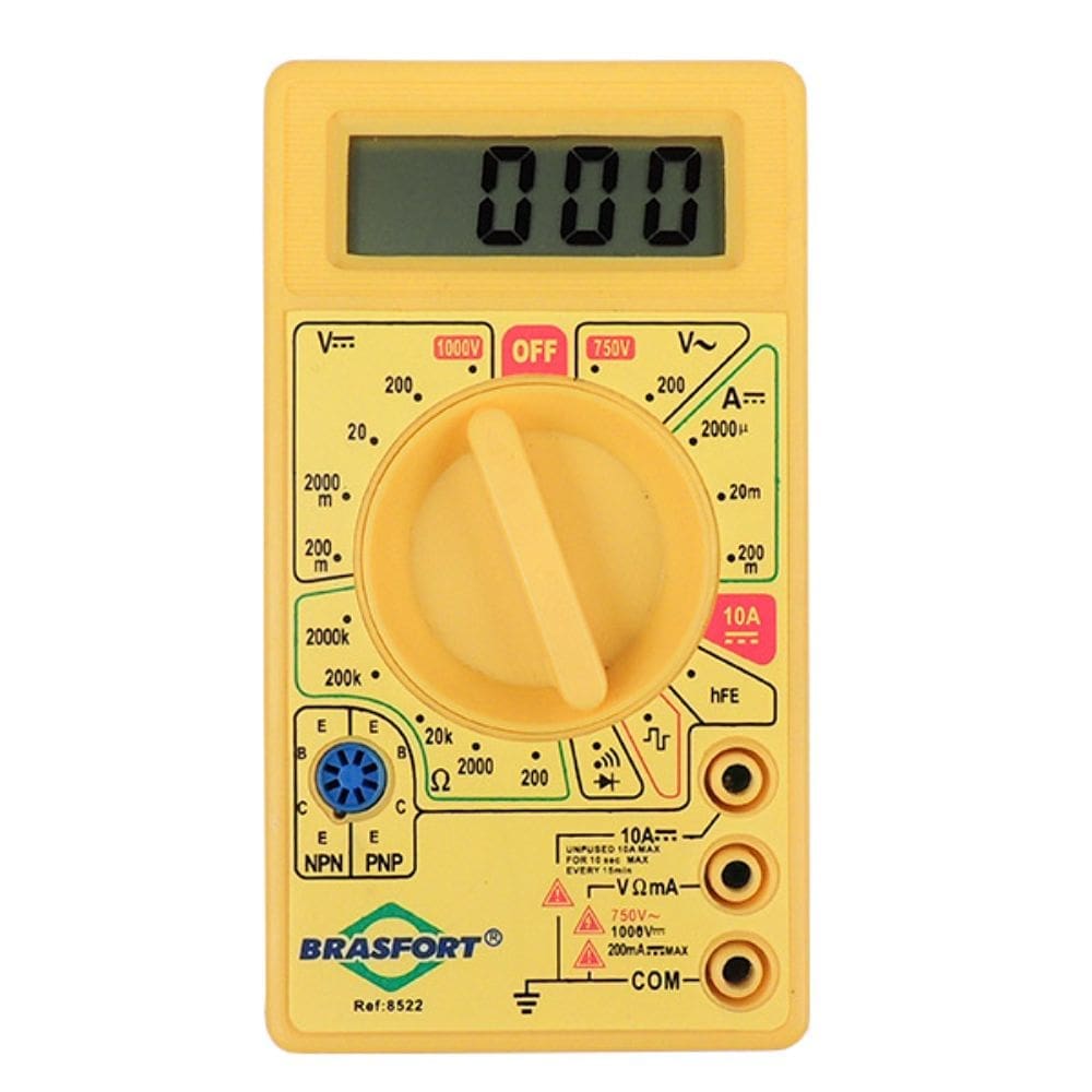 Visor de cristal líquido com 3 dígitos e meio. Produto destinado para oficinas mecânicas, laboratórios e bricolagem. Pode ser utilizado como instrumento de diagnóstico em instalações elétricas, manutenções e reparo de equipamento eletroeletrônico. Ao aparecer o sinal de bateria fraca no visor, desconecte as pontas de prova, desligue o aparelho e depois faça a troca da bateria. Quando for medir a resistência de algum circuito, ele tem que estar desligado e com os capacitores desligados. Essa ferramenta consegue executar 8 funções sendo elas: tensão alternada, corrente continua, corrente continua alta, teste de transistor, sinal digital, teste de diodo e continuidade, resistência e tensão continua.