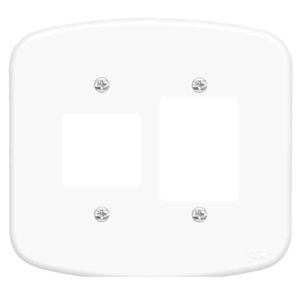 Placa, popularmente chamada de espelho, da linha Blanc da Fame. Para 2 interruptores em um lado e 2 tomadas ou 3 interruptores do outro. Arredondada, feita em ABS e de dimensões maiores oferecem acabamento liso perfeito que não risca e não retém sujeira, além da resistência aos raios UVA e UVB.