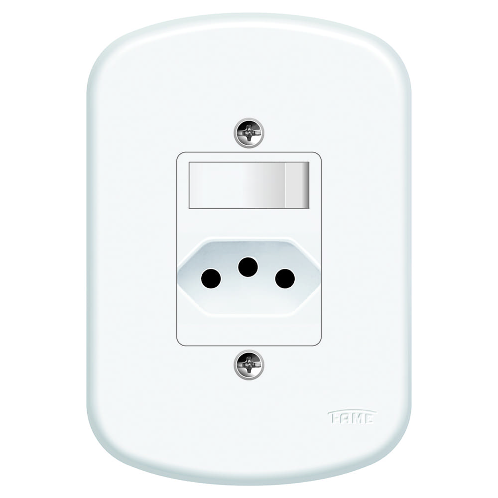 Conjunto contendo uma placa da linha Blanc da Fame e uma peça com 1 interruptor simples, ideal para o controle de lâmpadas, e 1 tomada 2P+T (três pinos) 10A/250V, ideal para aparelhos que consomem pouca energia, como tv, ventilador, computador etc. Com placas arredondadas em ABS e de dimensões maiores oferecem acabamento liso perfeito que não risca e não retém sujeira, além da resistência aos raios UVA e UVB.