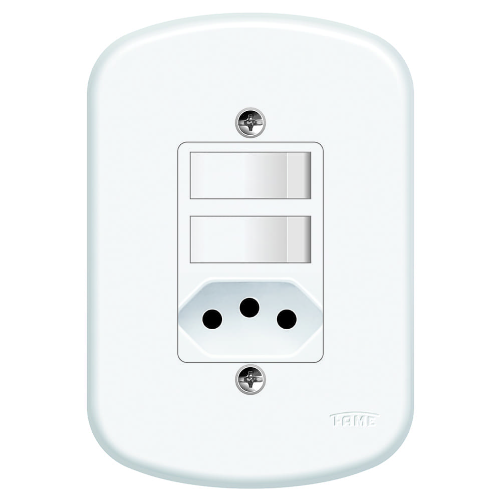 Conjunto contendo uma placa da linha Blanc da Fame e uma peça com 2 interruptores simples, ideais para o controle de lâmpadas, e 1 tomada 2P+T (três pinos) 10A/250V, ideal para aparelhos que consomem pouca energia, como tv, ventilador, computador etc. Com placas arredondadas em ABS e de dimensões maiores oferecem acabamento liso perfeito que não risca e não retém sujeira, além da resistência aos raios UVA e UVB.