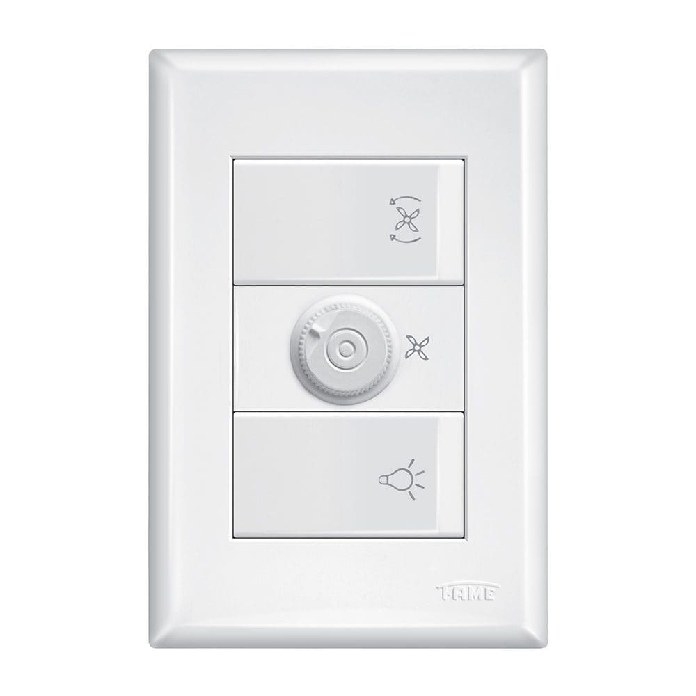 Conjunto com placa, suporte, botão para seleção da direção do ventilador, variador de velocidade do ventilador e 1 interruptor simples para o controle de lâmpadas. Indicado para ventiladores de teto com lâmpadas de todas as marcas que suportem o uso de variador de velocidade. A linha Evidence da FAME possui um design exclusivo, com a proposta de unir tecnologia e aparência sofisticada em perfeita harmonia. São modulares e possuem tratamento anti UVA e UVB.