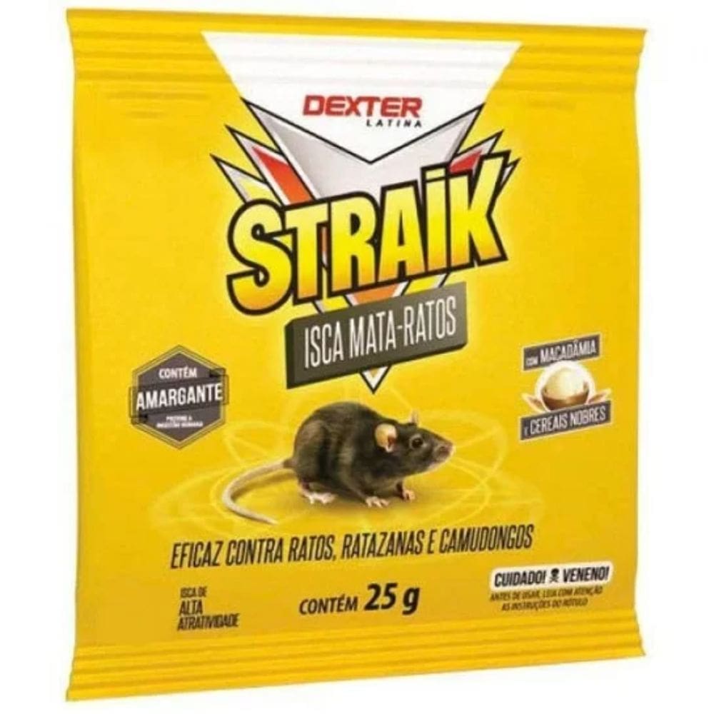 O Straik Isca Mata-ratos tem efeito anticoagulante e fórmula exclusiva, desenvolvida com cereais e sementes oleaginosas nobres, como a macadâmia, tornando-se altamente atrativo aos roedores e com a palatabilidade muito semelhante aos alimentos comuns que atraem essas pragas. Esse fator faz com que o Straik Isca Mata-ratos se diferencie das iscas tradicionais. É recomendado não só para residências, mas para áreas onde a oferta de comida é abundante, como locais de estocagem de alimentos.
